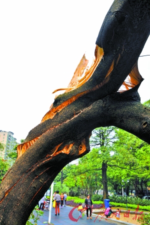 城南小学旁一棵大树被大风拦腰吹断。广州日报记者龙成通摄