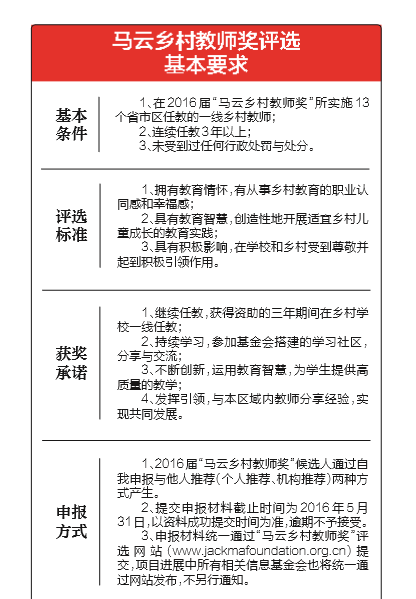 据了解,本次评选提交申报材料统一通过“马云乡村教师奖”评选网站(www.jackmafoundation.org.cn)提交,截止时间为2016年5月31日。