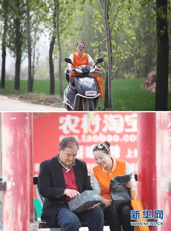 4月11日,电商吴佳佳骑行在河南省灵宝市阳平镇上阳村乡间小道上送货(上图);吴佳佳(右)为村民雷和林送来其儿子网购给老人的鞋子(下图)。从今年元旦开业到现在,吴佳佳的网店营业额已达13万元。吴佳佳说:“明年我要把我们村的苹果通过网店销往全国各地,让村里人再也不为销路发愁。” 眼下,穿梭往来的快递,已成为我国各地城乡的一道独特风景。 “互联网+”联手现代物流,不仅架起了乡村与外界之间的桥梁,缩短了人与人之间的距离,更改变着乡村居民的消费理念和生活方式。伴随车轮的转动,手与手的交接,活跃的经济因子在跳动,丰富的情感在传递,新奇的创业梦想在延伸。当快递遇到乡村,意味着无数个美丽的邂逅。每一次的投递,都寄托着人们对美好生活的向往。 新华社发(赵华 摄)
