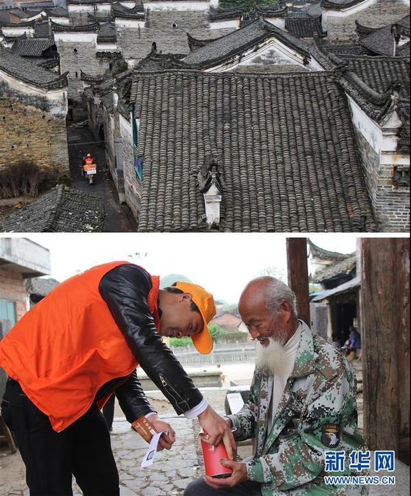 4月11日,农村淘宝店主廖小俊骑着摩托车行驶在湖南省永州市道县清塘镇小坪村(上图);廖小俊(左)给村民廖家洲送来家人为其网购的茶叶(下图)。眼下,穿梭往来的快递,已成为我国各地城乡的一道独特风景。 “互联网+”联手现代物流,不仅架起了乡村与外界之间的桥梁,缩短了人与人之间的距离,更改变着乡村居民的消费理念和生活方式。伴随车轮的转动,手与手的交接,活跃的经济因子在跳动,丰富的情感在传递,新奇的创业梦想在延伸。当快递遇到乡村,意味着无数个美丽的邂逅。每一次的投递,都寄托着人们对美好生活的向往。 新华社发(何红福 摄)