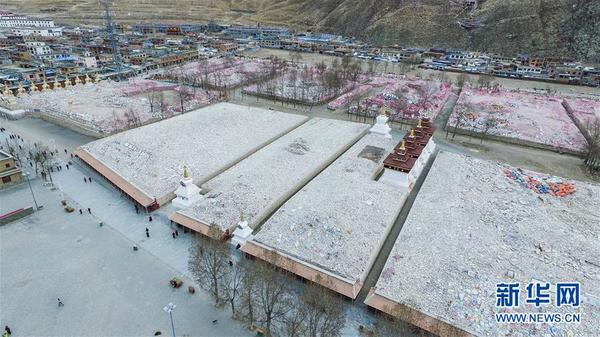 这是4月11日航拍的玉树市新寨玛尼石堆。4月14日为玉树地震6周年纪念日,曾经遭受地震重创的青海玉树已完成灾后重建,从空中俯瞰现代化的市政基础设施、商铺、城市雕塑等,给人们呈现出一座新玉树。新华社记者 吴刚 摄