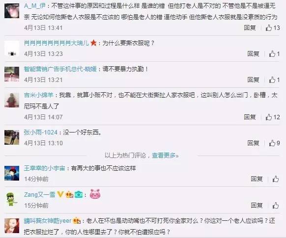 ▼ 不管这件事的原因和过程是什么样,是谁的错,但他打老人是不对的,不管他是不是被逼无奈,无论如何他撕老人衣服是不应该的,哪怕是老人的错,逼他动手,但他撕老人衣服就是没素质的行为。