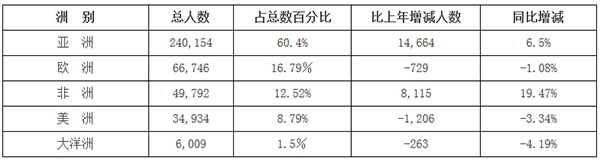 前10大生源国中,韩国、印度、巴基斯坦和哈萨克斯坦4国生源数均有所增长,其中印度、巴基斯坦和哈萨克斯坦同比增长均超过10%。来自亚洲和非洲的生源较上一年分别有6.5%和19.47%的增幅。