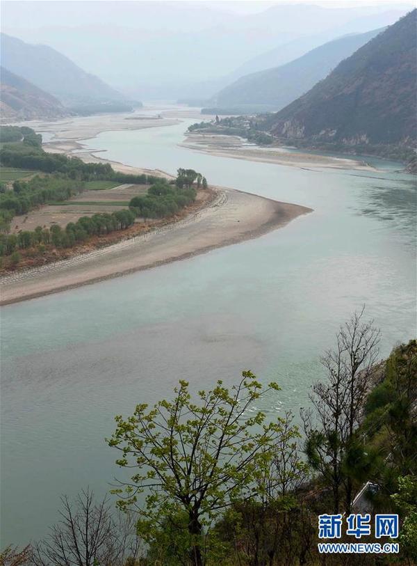 这是云南省丽江市石鼓镇绿树掩映下的“长江第一湾”(3月29日摄)。