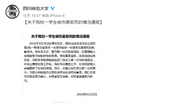 人民网成都4月15日电 (王军)今日,记者从四川师范大学获悉关于该校一学生被伤害致死的情况通报:3月28日0时17分,成都龙泉驿区公安分局接报,在龙泉驿大面街道四川师范大学成龙校区学生公寓发生一起杀人案。接警后,经调查,犯罪嫌疑人滕某(男,20岁,甘肃白银市人,川师大学生)与受害人芦某(男,20岁,甘肃白银市人,川师大学生)之间因生活琐事发生矛盾,3月27日23时50分,滕某在川师成龙校区学生公寓东苑2栋学习室用当日白天从超市购买来的菜刀将芦某杀死。后犯罪嫌疑人滕某于3月28日0时17分让同学打电话报警