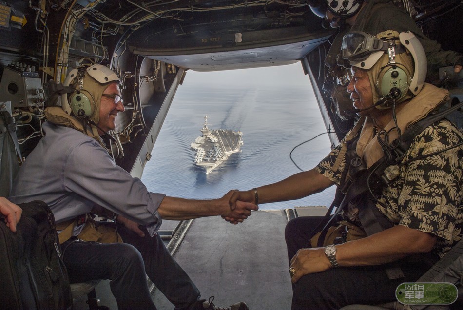 美菲防长携手登航母巡航南海 飞机上握手面露笑容