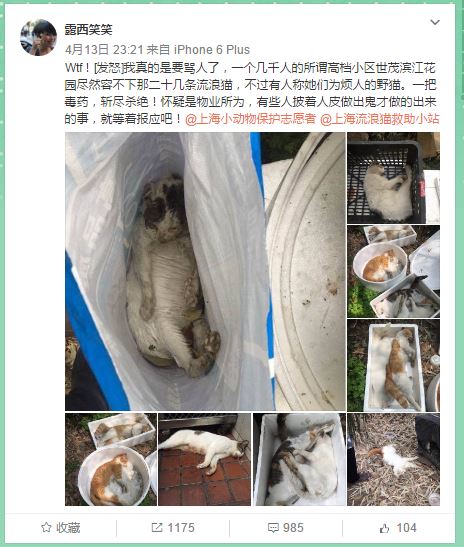 网友“露西笑笑”4月13日发了一条微博:“我真的是要骂人了,一个几千人的所谓高档小区世茂滨江花园竟然容不下那20几只流浪猫,不过有人称她们为烦人的野猫。一把毒药,斩尽杀绝!”