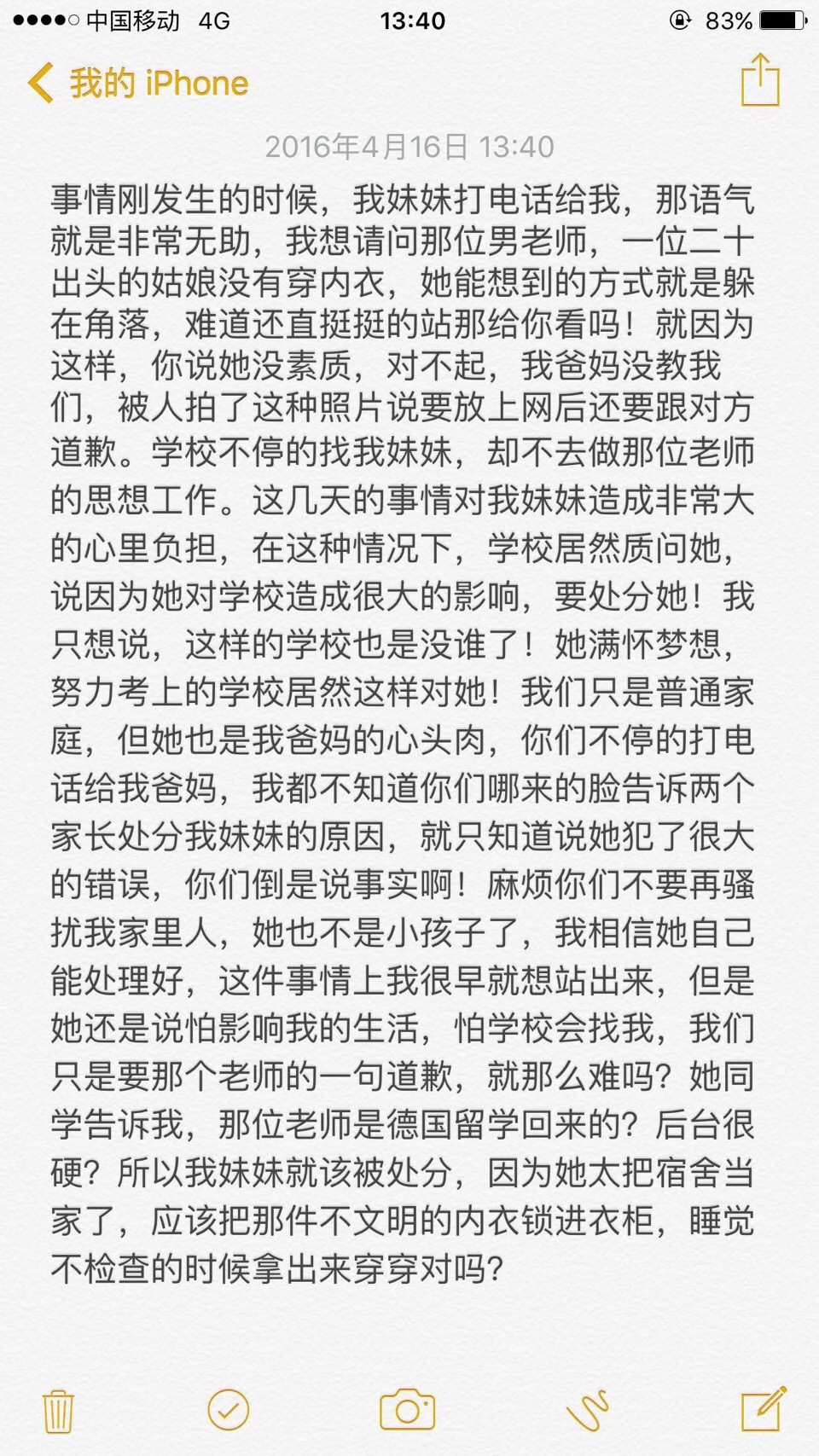 4月15日,当事女生发微博称,“昨天我被多个领导约谈,话语中多次明里暗里表示学校会因为这件事给我一个处分”;“昨晚十一点多和当事男老师电话联系,他表示已经将照片删除,态度很差,毫无悔意。”