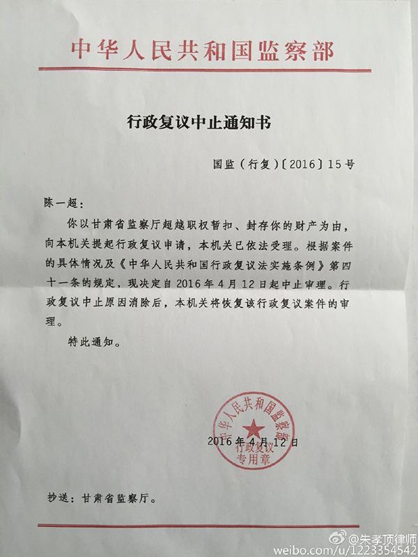 该通知书显示,对于陈一超以甘肃省监察厅超越职权暂扣、封存他的财产为由,向监察部提起的行政复议申请,已获受理。
