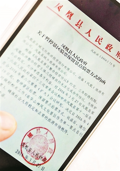 凤凰县人民政府关于景区暂停收取景区门票的文件是发给凤凰县古城文化旅游股份有限公司、启盛(凤凰)旅游有限公司和凤凰县城乡旅游有限公司的。2013年4月10日,凤凰古城开始对外收取148元的景区门票,正是由上述三方依据《凤凰县景区整合经营协议》执行收取的,据凤凰县政府相关人员介绍,在县政府的主持下,上述几方签订了景区经营协议,经营的期限是三年,至2016年4月9日结束。