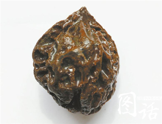 赵先生向记者一一介绍其依据:核桃外表已呈棕红色,而凹进的部分却是黑色;此外,核桃凸起的纹理有明显摩擦过的痕迹,部分已经磨得较为光滑……“核桃表面有一层包浆皮克,这应该不是食品,而是一件盘玩的耍件。”赵先生认为,这是一个非常重大的发现,或将改写历史。