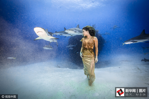 近日,一名拥有多年专业潜水经验的冒险者身着华丽的衣服在巴哈马群岛附近的海中拍摄了一组写真。她在拍摄这组图片时未戴任何呼吸工具,身边还不时有鲨鱼游来游去。此次拍摄活动在一个鲨鱼保护区进行,目的是为了警醒世人鲨鱼面临的灭绝危机。(图片来源:视觉中国)