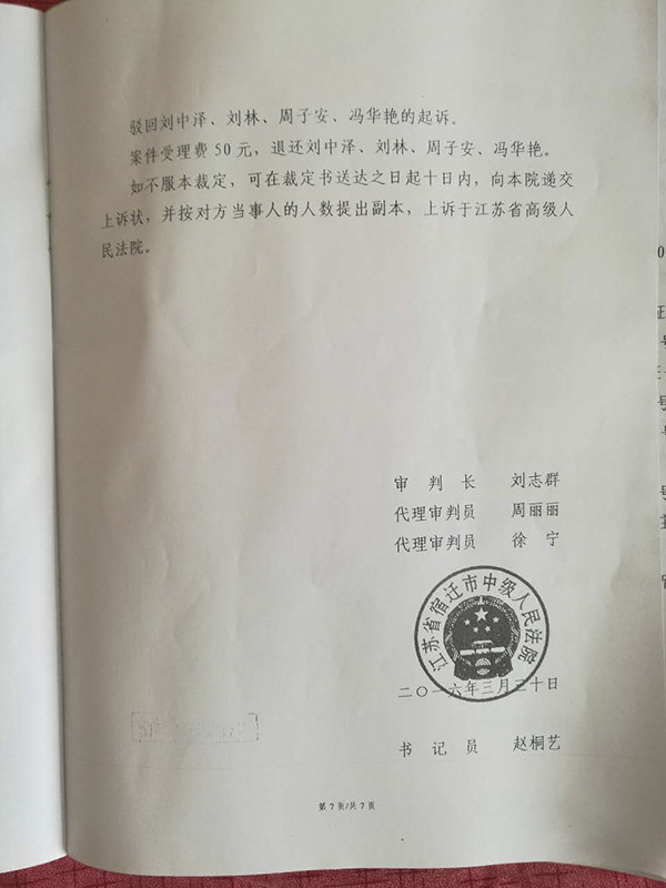 2016年3月30日,宿迁市中院作出裁定,该案属原告和原告单位间的劳动争议,不属于行政诉讼受案范围,驳回刘中泽等人的起诉。