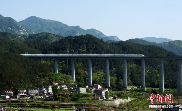 据了解,合武高铁经过的大别山地区,非常适合杜鹃花的成长。特别是合武高铁穿越湖北麻城市木子店镇长岭关村的大别山隧道后,铁路高架桥凌空而立,两岸青山似玉,杜鹃花海繁盛如火,吸引了无数游人的眼球。图为合武高铁飞驰大别山。中新网记者 翟璐 摄