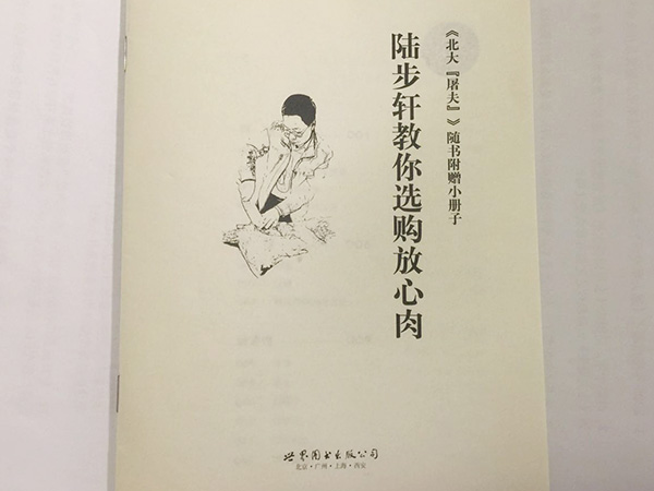 从2005年出版《屠夫看世界》到今天再版的《北大屠夫》,书不仅仅是名字的变化,最大的不同是在新书中附赠了一本名叫《陆步轩教你选购放心肉》的小册子,册子中不仅介绍了各种猪的类型、关于生猪的常见病疫症,还有介绍如何挑选排骨、腰子、板油的部分。“如果把这个看好了,最起码不会买有病的猪肉。”陆步轩介绍道,这本小册子是摘选自他在屠夫学校的讲义,原先的讲义有20万字,摘出来的这一部分是特别站在消费者角度上,教消费者如何看待猪肉的品质、如何选择猪肉的。