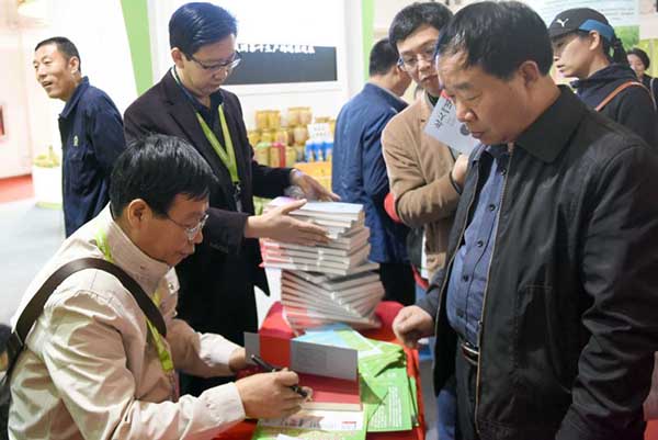 陆步轩在摊位前为读者签赠新书。