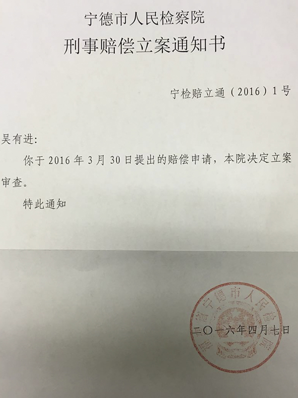 获得无罪判决后,吴有进申请国家赔偿,2016年4月7日,宁德市检察院已立案。