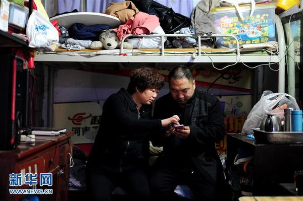 4月20日,在郑州市西大街与延陵街交叉口附近的一个窝棚里,钱爱芬在教陈代军用手机查看网络寻子平台的信息。新华社记者冯大鹏 摄