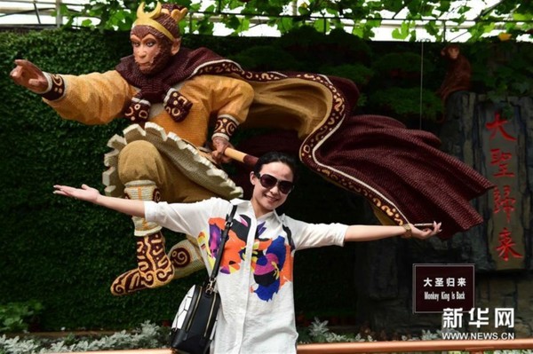 4月20日,在寿光市蔬菜高科技示范园,市民在第十七届中国(寿光)国际蔬菜科技博览会展出的“孙悟空”景观拍照留念。