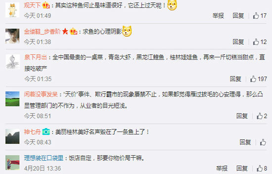 桂林山水甲天下,但桂林的“天价鱼”却让人不敢恭维。网友纷纷吐槽,“这鱼不仅味道鲜美,还上过天呢!”“桂林美好名声毁在一条鱼上了”,对于物价局“双方协商好就合理”的说法,网友也表示不可理解,“饭店自定,还要物价局干嘛?”。与此同时,更多的网友质疑,监管部门到底在监管什么,“‘天价’事件屡禁不止,凸显监管部门的不作为,经营者的目光短浅”。