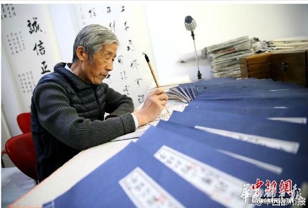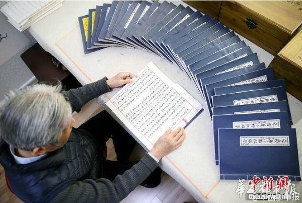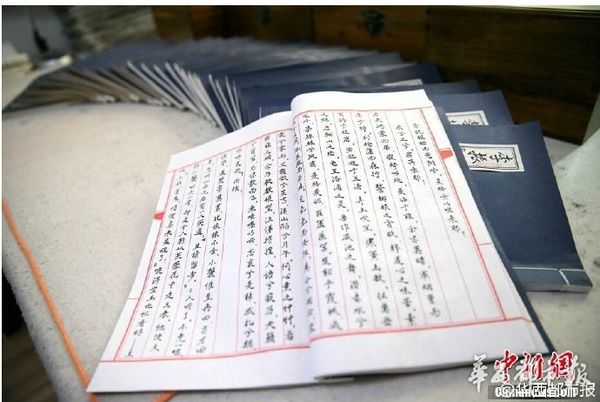 陕西咸阳82岁老人李振华,用时三年,纯手工抄写《红楼梦》前80回70余万字,共计32册。李爷爷从2012年初开始抄,至2014年底完成,三年来每日坚持抄写3至4个小时,仅毛笔就用坏了40余支。老人手抄的《红楼梦》还将印刷出书!(中国新闻网)