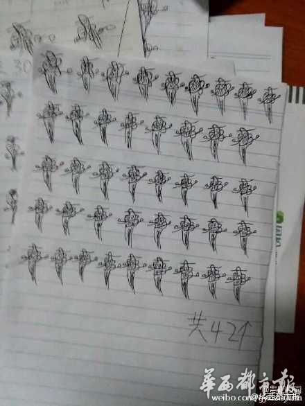 近日有网友爆料称,成都@电子科技大学成都学院 通信系几名学生因上课迟到,被辅导员罚抄1000个表情包。写在纸上满满的都是爱啊!(中国新闻网)