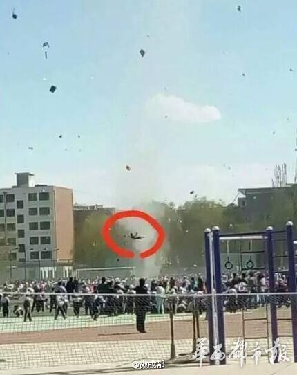 20日下午,甘肃一小学开运动会,场地突发龙卷风,一名小学生被卷起几米高!所幸该学生后脑勺轻微受伤。事件发生地酒泉市瓜州县,年均三分之一的时间刮7级以上大风,有“世界风库”之称,也是我国首个千万千瓦级的风电基地。(央视新闻)