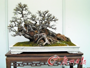 事实上,岭南盆景作为中国五大盆景流派之一,虽然比“苏派”、“扬派”盆景的历史短,但在技巧上别具一格,强调蓄枝截干,达到造景浑然天成的境界。谢荣耀介绍道,在养盆景过程中,他主要以剪截为主,即根据树胚和造型的需要,对树干进行裁剪,对枝条进行蓄养和截短,让新枝在合适的位置萌发,待枝叶长到大小合适再进行裁截。“这也是为什么岭南盆景的生长期比其他流派都要长的原因。如果用铁丝辅助固定形状,时间是短了,但长出来的枝条形状扭曲,人工痕迹重,不好看。”