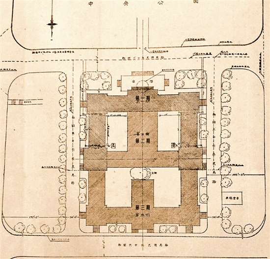 市府合署总的设计平面图,可看出前座、后座、中央大礼堂等的布局