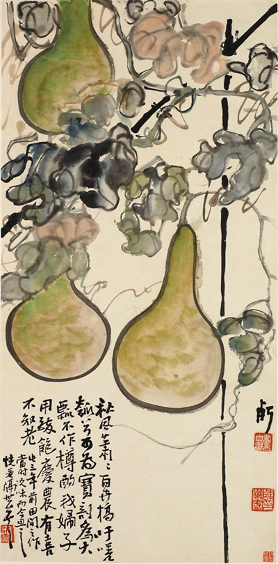 陈师曾的花鸟画师承海派画家吴昌硕(1844—1927),而吴昌硕也是一个兼擅葫芦绘画的大家。吴昌硕的葫芦画,一般构图繁密,葫芦与枝叶交相辉映,密不透风,其技法则是以传统为主,设色鲜艳,藤蔓多为花青兼赭色,间亦用浓墨兼花青,而葫芦多为大亚腰,腰围浑圆,以赭色混合鹅黄直接绘就,并无勾线,偶尔混杂几只南瓜或白描葫芦,与画面相映成趣。吴昌硕常在画中题句:“胡芦胡芦,尔安所职?剖为大瓢,醉我斗室。”而陈师曾诗中“剖为大瓢不作樽”,很明显便来源于此。吴昌硕常常一题多画,除此题外,常见的“实垂垂,悬清秋;千金值,在中流”和“依样”也在其画中多次出现。无独有偶,陈师曾也在其画中题识“依样”,且至少有三件作品反复题写上述“秋风萧萧百卉稿”诗句。这种一题多画的现象很大程度是来自受画者的需求,这就说明陈师曾在当时也和吴昌硕一样,受到收藏者的追捧。但在技法上,陈师曾已完全背离了吴昌硕,不仅构图疏松,画面有大片的留白,所绘葫芦也均为纺锤葫芦,且融合水彩技法,与吴昌硕大异其趣。