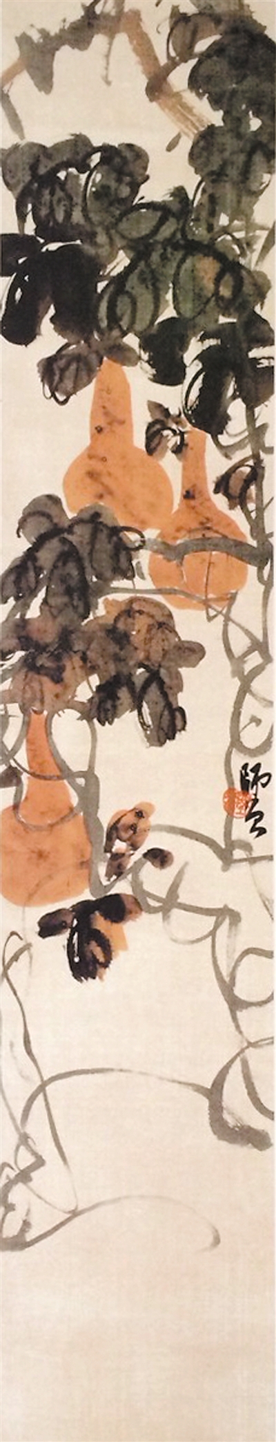 有意思的是,受陈师曾影响较大的齐白石也擅长葫芦,但与吴昌硕、陈师曾迥然有别。齐白石所绘葫芦一般用浓墨渲染大片叶子,以鹅黄和橙黄绘大小亚腰葫芦,偶尔也用白描写葫芦,有时喜欢绘一只工整的蛐蛐、蜻蜓、瓢虫或螳螂作为点缀,别具一番趣味。这种构图、趣味与陈师曾似有天壤之别。这似乎正应了齐白石那句名言:“学我者生,似我者死。”而陈师曾自己也曾说:“画画不可离开古人,也不可全靠古人。譬如学甲的画,学到顶高处,也不过是与甲一样,结果只是成甲。学乙的画,学到顶好处,也不过是与乙一样,结果成乙。必须学甲的,也学乙的,取甲乙的好处,而自己造出一个丙来,才能卓然成家。”陈师曾是这样,齐白石也是这样,而吴昌硕更是这样。正是三位艺术大师自出机杼的艺术品格,师承而不盲从,才成就了他们在20世纪绘画史上的特殊地位。
