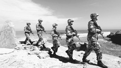 迎着清晨喷薄而出的红日,一队队手握钢枪的官兵凭海临风,沿着礁石正在巡逻。