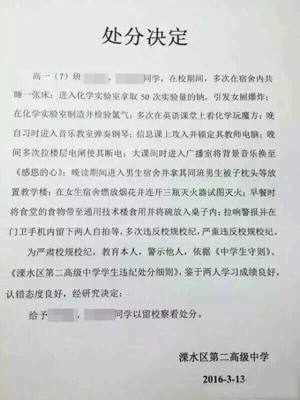 这张“处分决定”称,南京市溧水二中高一(7)班两位女生有一系列在校行为出格,包括在化学实验室制造并检验氯气;晚自习进入音乐教室弹奏钢琴;多次拉楼层电闸使其断电;晚读期间进入男生宿舍并拿其同班男生被子枕头等放置教学楼;在女生宿舍燃放烟花并开三瓶灭火器试图灭火;早餐时将食堂食物带出;拉响警报并在门卫手机内留下自拍等。