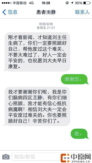 “2016年春节,刘主任还接到了上海患者的拜年短信。”李丹说,2015年农历春节前,一名上海的男青年在郑州火车站宾馆突发疾病被120送到医院,在未联系到该青年家人时,刘轲不仅给其垫付了诊疗和住院费用,还带着学生守着这名患者,照顾他吃喝拉撒。患者家人到来后,最初不信任、冷漠,但是出院时感激得热泪涟涟。