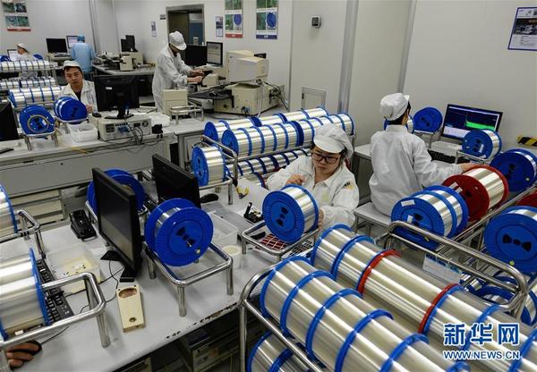 工人在苏州吴江亨通集团光纤生产车间检测产品(4月15日摄)。 知道崔根良的人,远不如使用他光纤的人多。他带领的亨通集团,是我国三大运营商的光纤供应商。中国每4公里光纤中,就有1公里来自这里。神舟九号与天宫一号对接中,亨通光缆完美执行了任务,中国第一艘航母辽宁舰亦蕴藏了一颗“亨通芯”…… 这背后,凝聚了崔根良30多年的心血:从濒临倒闭的乡镇企业起步,他带领亨通集团在航空航天、军工装备等领域获得2000多项国家专利、制定150多项国家行业标准。他打破国外技术垄断,使得亨通集团成为中国在光纤通信领域唯一拥有光纤预制棒核心技术及自主产权的民族企业,并获得全球卓越绩效最高奖。数据虽抽象,含义却很丰富。 新华社记者 季春鹏 摄