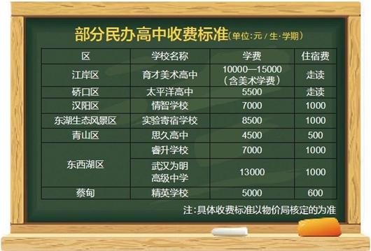 昨日,武汉市公布的今年民办高中收费标准显示:多所民办高中收费有所上调。如育才美术高中去年学费为每生每学期6500元,今年提高到每生每学期1万至1.5万元(含美术学费)。情智学校学费由每生每学期5500元提高到7000元。蔡甸区精英学校学费由每生每学期4500元提高到5000元。