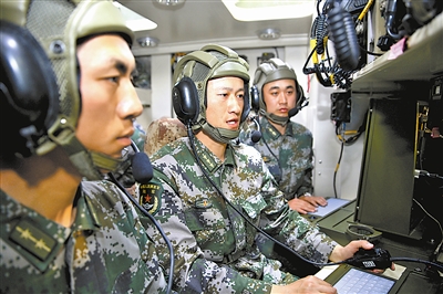 上图:营参谋长苏日烈(中)和2名参谋正在分析情报信息。任兴志摄