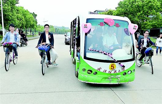 昨日中午1时许,当载有两对新人、贴着喜字的校园电瓶车,在武汉纺织大学阳光校区内绕行一圈时,沿途吸引了数百名学子围观,回头率百分百!这场好玩有爱的校园婚礼,被该校学生刷了屏:“校车被打扮成了‘婚车’,这婚礼太酷炫了吧!”“要不要这么浪漫啊,真是虐死‘单身狗’。”