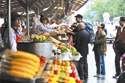 东华门小吃街占据东华门大街道路的北半部分,但经营范围早已不是最初的北京小吃,北京青年报记者昨天在探访中发现,近百家摊位中,除了爆肚、糖葫芦等几样少得可怜的北京小吃,四分之三的摊位都有烤肉串烤鱿鱼等各种烤串,顾客也很少有北京市民,最常见的是跟着导游走进小吃街的外地游客,以及乘坐出租车来此的外国游客。