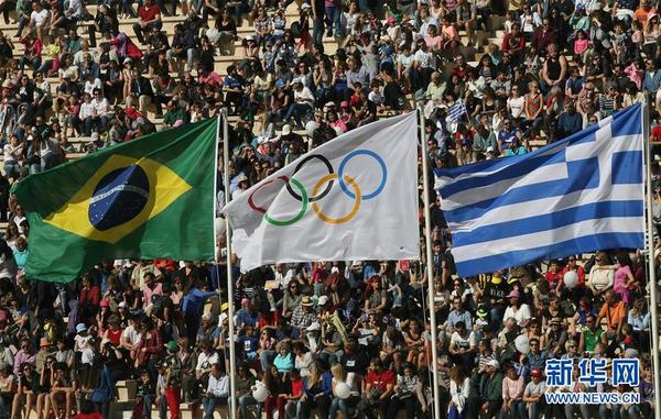 4月27日,巴西国旗、国际奥委会会旗、希腊国旗(从左到右)飘扬在雅典大理石体育场上空。当日,里约奥运会圣火交接仪式在第一届现代奥运会举办地、雅典大理石体育场举行。新华社发(马里奥斯·洛洛什摄)