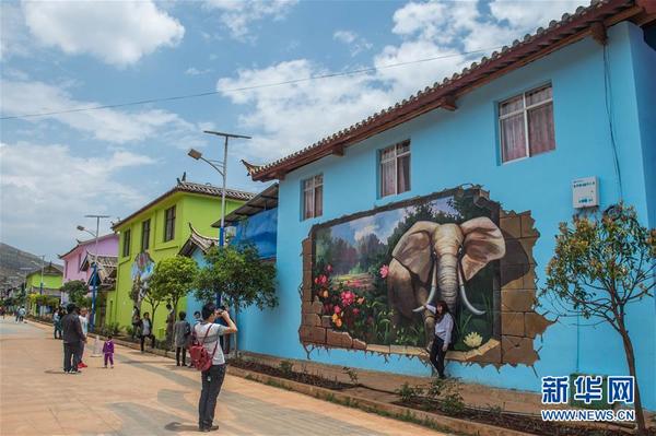 4月27日,游客在金龙村一幅3D立体画前拍照留念。2015年下半年以来,云南省丽江市七河镇金龙村通过统一规划,为村里的442栋庭院式房屋陆续刷上了9种颜色的彩绘,有的墙壁还画上了大幅的3D立体画,让这个深山坝子中的村落充满了艺术气息。最近,随着彩绘逐渐完成,各地游客纷至沓来,“彩色村庄”金龙村人气大旺。据了解,金龙村村民均为外迁来的移民。为实现移民“搬得出、留得住、过得好”的生活目标,当地通过创新开发旅游项目,带动村民发展致富。新华社记者胡超摄