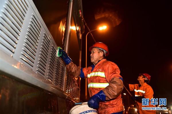 4月29日凌晨,合肥市市政工程管理处几名队员在合肥一座高架桥上清洗隔音屏障。晚上10点至次日早晨6点,是安徽合肥市市政工程管理处“月亮部队”最忙碌的时间段。“月亮部队”共有队员368名,分设施巡查、应急处置、养护维修三支分队,承担着市内道路、照明、桥梁等公共设施的巡查、应急、养护维修任务。为最大限度地降低施工对市民出行造成的影响,几乎全部养护维修作业都在夜间进行。新华社记者刘军喜摄