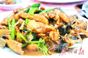 东升镇仕林饭店老板孙仕林介绍,《锦上添花》的主要用料是脆肉鲩的鱼腩部位,将鱼腩用少量的糖和盐先腌制几分钟,配上仕林饭店秘制的调料,再放入高温的油锅去炸。表面看起来金灿灿的黄金丝,是用土豆丝油炸而成。