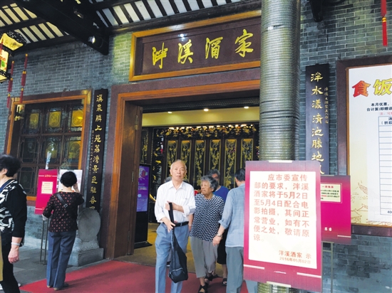 昨天早上,记者来到泮溪酒家。“慧鸣酒楼”的牌匾已经不见了。在门口竖立着一块酒楼的告示牌:“应市委宣传部的要求,泮溪酒家将于5月2日-5月4日配合电影拍摄,其间正常营业,如有不便之处,敬请原谅。”