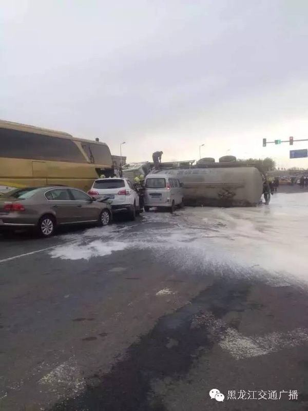 哈尔滨一大罐车侧翻砸中2台轿车多车受波及 1人死亡4人受伤