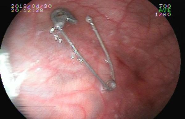4月30日晚上8点,已下班的消化科医护赶回医院,给患儿行急诊胃镜检查。果不其然,别针就在其胃里。令人揪心的是,别针还开着口,针尖儿裸露。“这种情况很可能因为胃的蠕动导致针尖儿刺入胃壁,导致穿孔、出血、腹膜炎、休克甚至危及生命等严重并发症。”