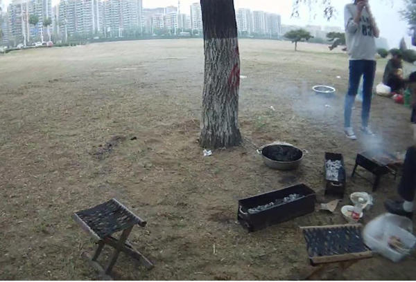 5月5日,城管执法人员发现小树林里聚集了七八个人,在附近草地上放置了三个老式烧烤炉,已经把木炭点着,冒着浓浓的黑烟,正准备烧烤。