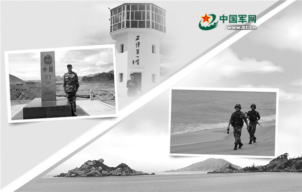 图左:巡逻途中,孙峰与祖国界碑合影留念。赵培县摄 图右:田全彬(左一)带队巡逻在海防线上。戴换策摄