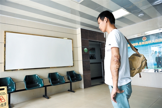 吴先生今年26岁,来自广东湛江。5月5日中午,记者在武警边防部队总医院门口对其进行采访。据吴先生介绍,他出生两个月大时,被发现左胳膊有血管瘤。来深圳打工后,吴先生开始寻找医院求诊。“2013年,我在百度搜索‘血管瘤治疗哪家医院好’,它就弹出一个武警医院,还有一个视频介绍用了什么方法治疗,我感觉武警医院是公立医院,信得过,就来了”。