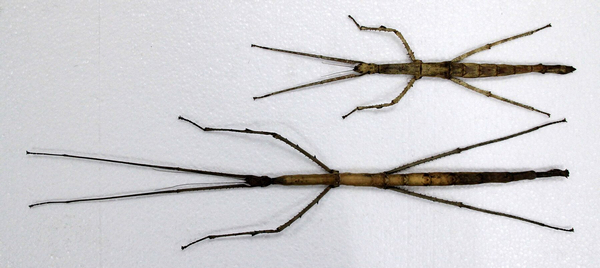 “过去世界最长昆虫纪录,是2008年在马来西亚沙巴州发现的一只22.3英寸(56.7厘米)长的竹节虫,现在保存在英国伦敦自然历史博物馆。”成都华希昆虫博物馆馆长赵力介绍,这只曾氏竹节虫“世界最长”的头衔现在已被打破,“2014年,这只竹节虫在广西省柳州市附近山区被发现。它最大个体身体长度达到36.1厘米,包括足全长超过62.4厘米。比曾氏竹节虫全长还要长5.7厘米,而身体则比前者长0.4厘米。”